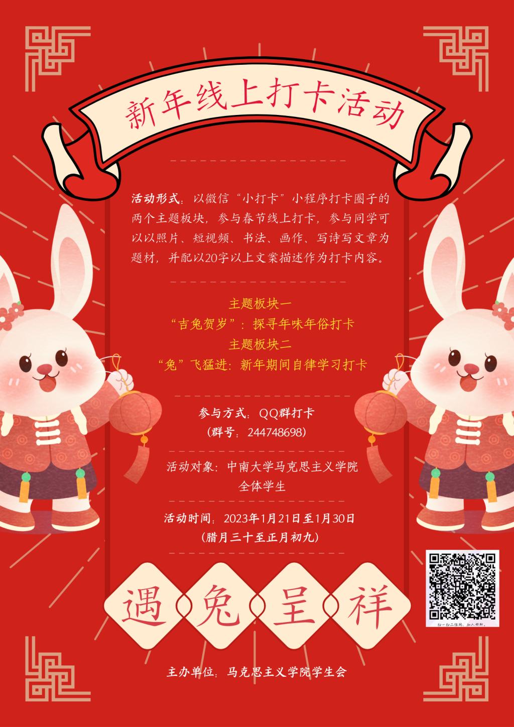 为丰富同学们的寒假生活,展示祖国各地不同风俗下的迎新春特点,了解地方特色,弘扬中华优秀传统文化。英国上市官网365学生会特举办“遇兔呈祥—新年线上打卡活动”,在寻年味、探年俗中,深入挖掘中华优秀传统文化精神内涵。