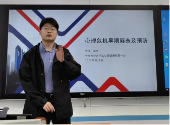 会议伊始,尚文老师以近期的热点话题为切入点,围绕大学生心理危机的预防和干预展开叙述。随后从心理危机预防与干预的意义、发现及识别、应对策略三个角度出发,重点阐述了心理危机的含义和种类、大学生常见的心理危机反应、需要重点关注的同学、重点监控的七个重要时段等内容。尚文老师将专业知识与自己的实践经验相结合,帮助学生了解心理危机发生的原因、学生压力产生的特点、心理问题的表现形势、心理危机评估方法等基本知识。