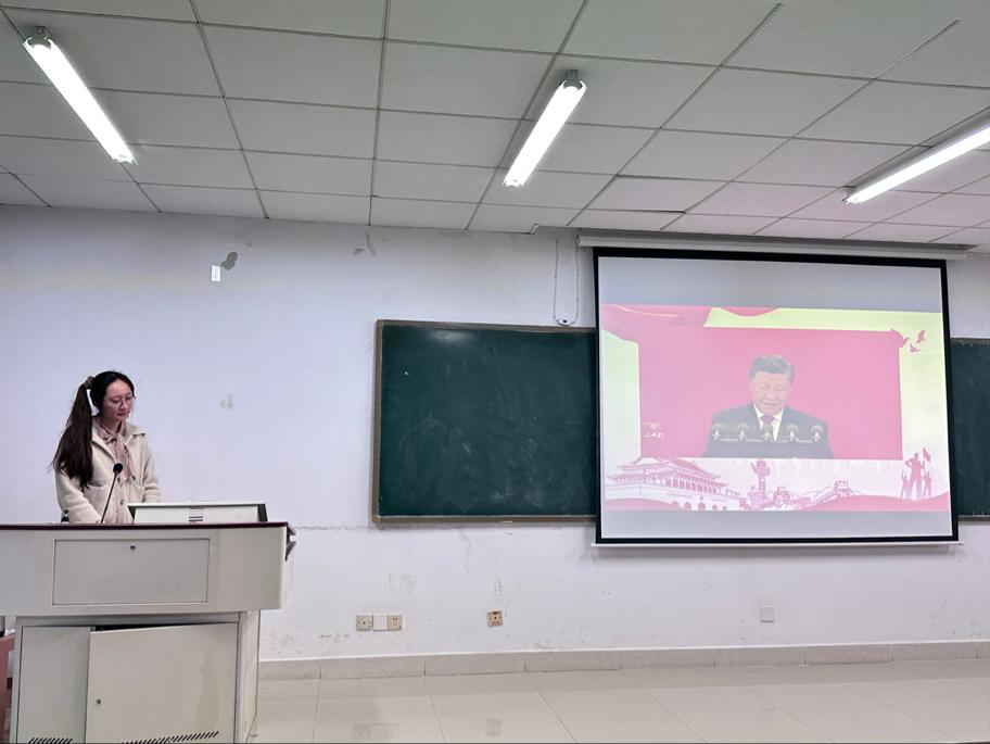 随后,学术科研部部长刘乐嫣从二十大大会主题、二十大报告概述、个人感悟与思考三个部分分享了她学习二十大后的个人感悟。