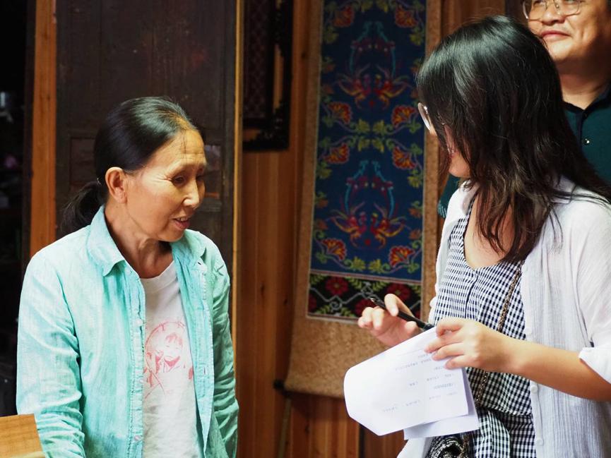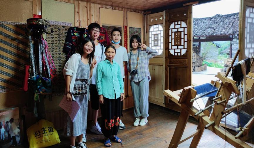 下午三点左右,实践团队来到苗儿滩镇惹巴拉,并对惹巴拉当地居民开展调研。在此实践团队有幸对国家级非物质文化遗产项目土家族织锦技艺代表性传承人刘代娥老师进行访谈,刘老师为实践团队简单介绍了西兰卡普,其中复杂多样的技巧和精美绝伦的织锦作品令人惊叹,另外刘老师表示自己会说一些简单的土家语,并且曾在其创建的土家织锦传习所开设土家语课堂,专门针对当地居民教授土家语,刘老师凭借其在土家织锦——西兰卡普上的高超技艺培养出了众多学徒,学徒来自全国各地,并在学成之后创办相关企业,对于西兰卡普的传播和经济效益转化发挥了巨大的作用。另外,刘代娥老师经常受邀在中南民族大学讲课,教学土家织锦技艺。访谈结束之后,实践团队与刘代娥老师合影留念。