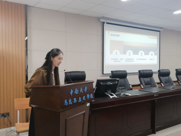 第二部分,班长唐普研向大家强调了疫情防控常态化期间学生管理工作,并为同学们介绍各项注意事项。班级内应坚决落实学生出校申报制度、掌握学生活动轨迹,坚持每日健康打卡,做到体温一日一测一报,发现异常情况第一时间上报辅导员与班导师,对同学们的防护安全负责。