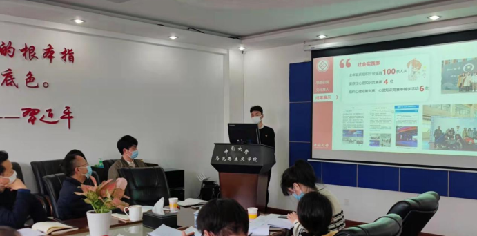 最后,研究生会副主席叶本煜从思想引领、文化育人、成果展示等方面对学院研究生会工作进行了汇报。在过去的一年里,我院研究生会先后组织党史学习教育10余次、学术实践活动15次、体育赛事活动5次,成功开展了“东方红”学术论坛、研究生新生学术沙龙、心理知识竞赛、“缘来有你、预谋邂逅”线上交友等活动,取得了优异成果,致力于将研究生会打造成一支“言马”、“信马”、“行马”、“爱马”的先进学生组织。