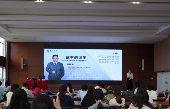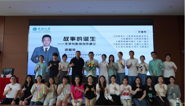 讲座中,梁教授与中南学子分享他对文学影视创意的独特看法,畅谈创作技巧与灵感。他结合自身的创作经验及作品,从文学与影像的关系、叙事的永恒主角——人、创作者的态度、创意情景四个方面展开报告,讲述了文学与影视间的交集在于叙事、人物塑造、结构情节、视角转换等。