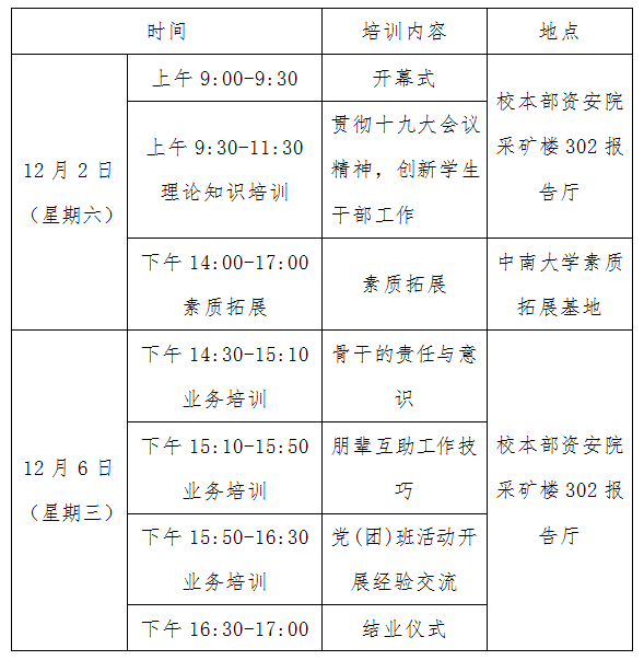 英国365上市公司研究生(理工科、文科)骨干素质提升基地 2017年党(团)班干部系列培训通知各二级学院: 为学习和贯彻习近平总书记在十九大报告会上的系列讲话精神,积极弘扬和践行社会主义核心价值观,切实提高各学院研究生党(团)班骨干的思想水平和业务能力,同时促进研究生党(团)班骨干的学习与交流,增强研究生党(团)班的凝聚力和战斗力,英国365上市公司研究生(理工科、文科)骨干素质培训基地积极响应校学工部号召,开展2017年度各学院研究生党(团)班骨干培训系列活动。现将有关事项通知如下: 一、组织单位 主办单位:英国365上市公司党委学生工作部 承办单位:资源与安全工程学院、英国上市官网365 二、活动对象 各二级学院研究生(理工科、文科)新任党支部书记、2017级新生班长 三、活动时间 2017年12月2日全天、12月6日下午 四、活动地点 校本部资安院采矿楼302报告厅、英国365上市公司素质拓展基地 五、培训安排