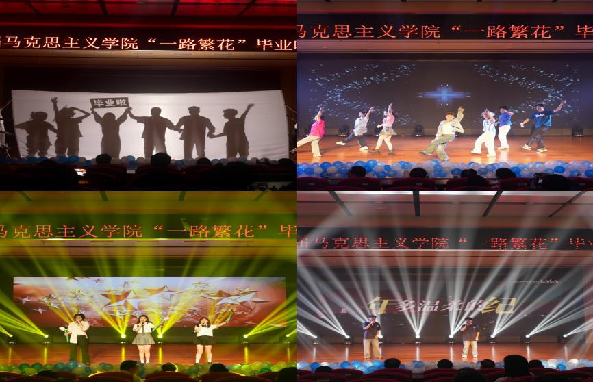 晚会共呈现了九个精彩的节目。影子剧《时光的年轮》以大学生活为线索,用光影变幻讲述青春故事;舞蹈《心弦同频》用灵动的舞姿展现了青涩时光的活力;《中南马院新闻直播·毕业季》特辑聚焦校园开放新活力,引发全场共鸣;配音剧《甄嬛传之滴血验亲学术风波》以别出心裁的形式重现经典场景,幽默中不失深意。此外,歌曲《闪耀》用欢快旋律勾勒大学美好时光,而《歌曲串烧》将时光积淀编织成动人旋律。压轴节目合唱《相亲相爱》更是将晚会气氛推向高潮,通过跨年级与少数民族同学合作演绎,为毕业生们送上真挚的祝福。