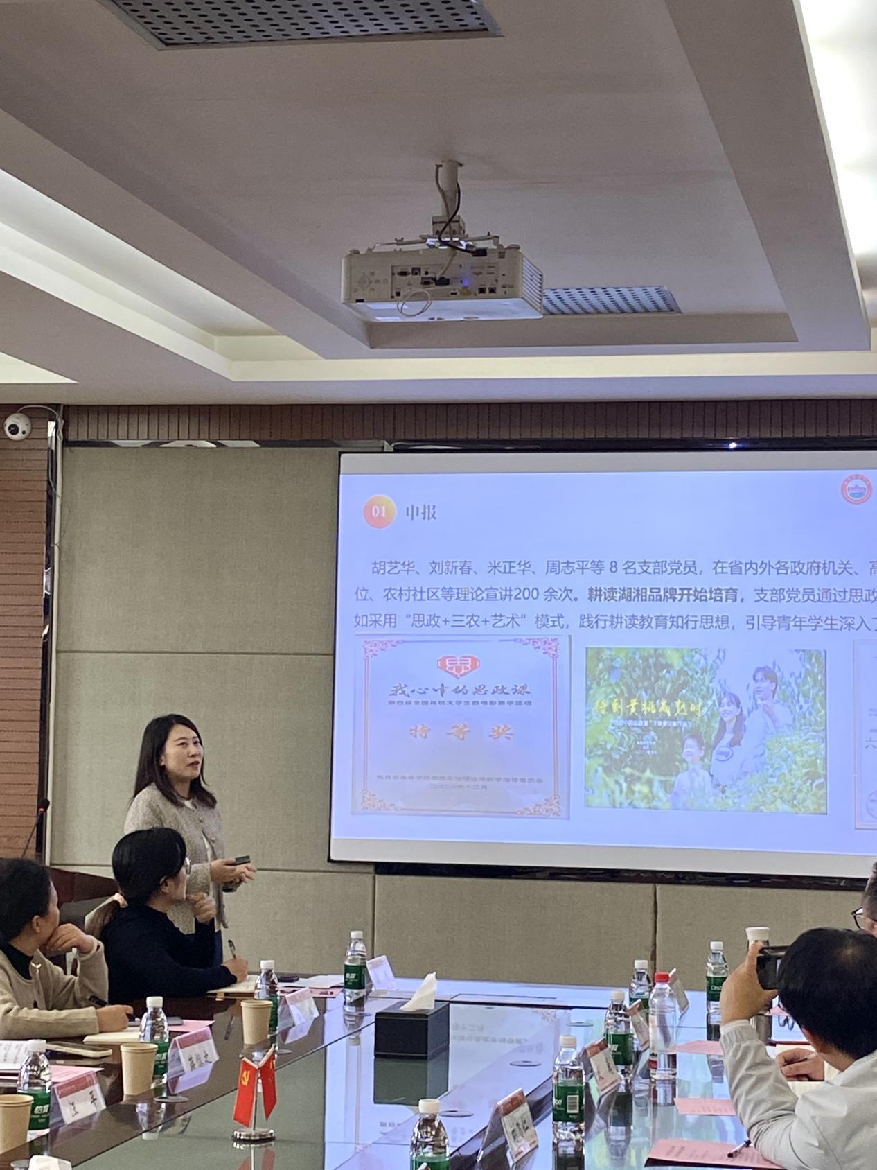 随后,湖南农业大学马院教工第二党支部书记蒋慎之老师为大家带来精彩分享。蒋老师所在支部先后入选了全省高校党组织“对标争先” 建设计划样板党支部和全国党建工作样板党支部培育创建单位,她以王国维谈读书的“三重境界”为引,结合全国样板党支部申报、建设和验收的过程,详细介绍了支部在组织生活创新、品牌建设中持续锤炼“马+农”特色的经验做法,以及“三融三促”党建工作机制下支部在教学、科研和社会服务方面取得的实践成效。
