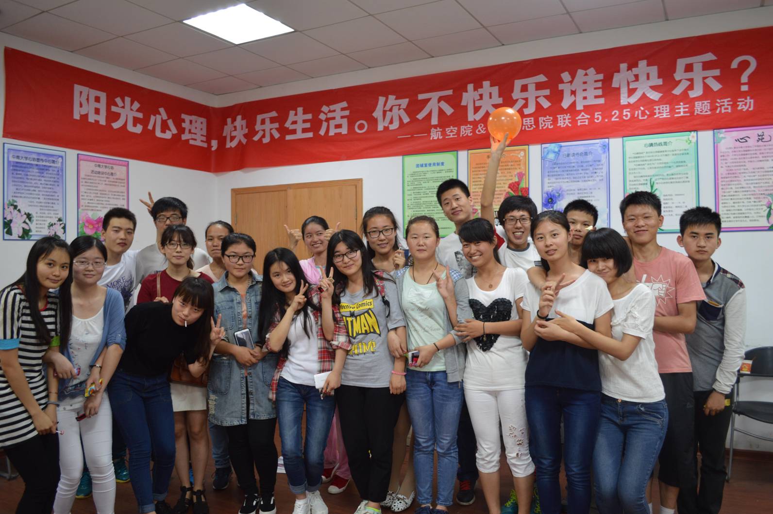 5月16日下午两点,英国上市官网365和航空航天学院心协分会在南二舍心理咨询中心开展了“阳光心理 快乐生活”525综合拓展活动。在两院心协分会会长及干事的精心准备下,联谊活动顺利开展,机电院心协分会会长作为嘉宾也参加了此次活动。 本次活动由5个小游戏组成,活动开始前现场随机抽签分成五组。随即主持人袁丹林带领大家进入欢乐的游戏环节,第一个游戏是“吞水传音”,每队成员分别嘴里含一口水依次传递抽中的词语,游戏过程中诙谐幽默的动作和言语引起现场阵阵笑声。第二个游戏是“倒水接力”,每组成员依次用嘴巴叼一次性纸杯接住上一个同学传来的水,这个游戏考验的大家的配合程度,有的队伍手忙脚乱,打翻了水杯,有的团队则有条不紊,井然有序。第三个游戏是“背对背夹气球”,每组两位同学吹气球,两位同学背对背夹爆气球,用时最短者胜。接下来的“不听指挥”和“踩报纸”的游戏也体现了参赛人员的反应速度和团队合作的重要性。伴随着大家的欢声笑语,5个游戏圆满结束。 最终,第五组凭借良好的发挥勇夺桂冠,第二第三组紧随其后获得二等奖,第一组和第四组获得三等奖,本次活动不仅加深了马克思院、航空航天学院和机电院三院的感情,也让大家意识到快乐源于对生活的理解,源于同学的合作,源于人际沟通,源于彼此间正能量的传递。在简单的颁奖和合影后,本次拓展活动在欢声笑语和依依不舍中落下帷幕。