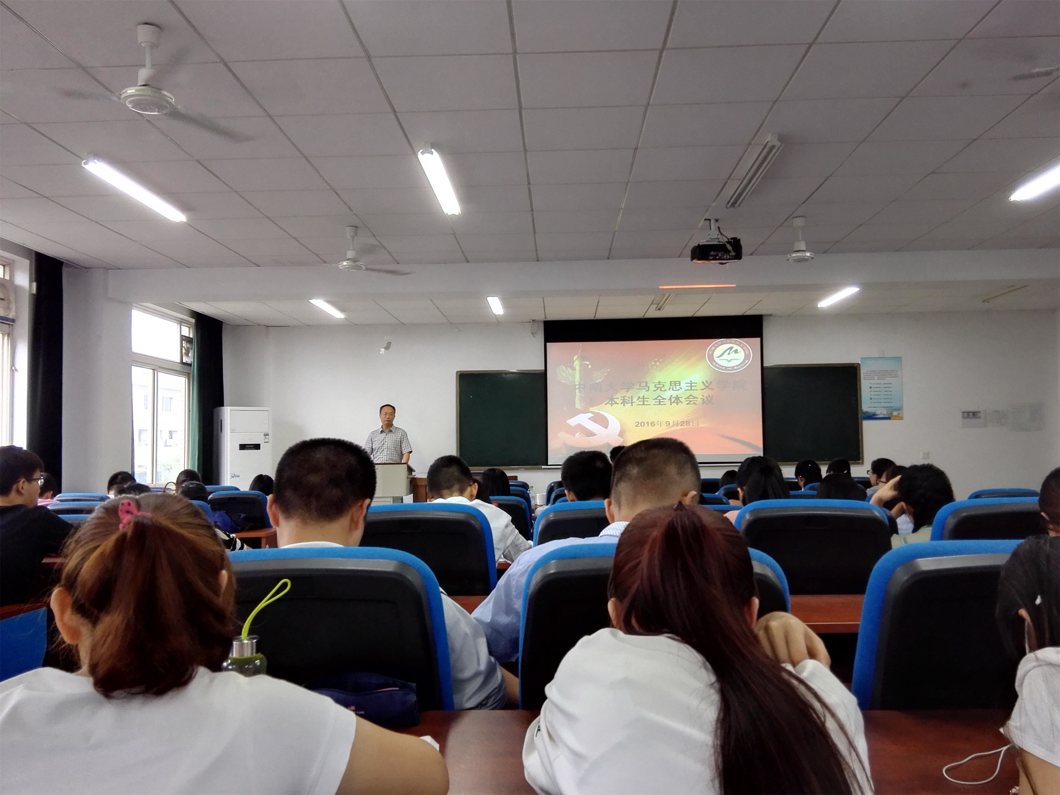 会议开始,主讲人杨雪宾副书记亲切地欢迎16级新生们,对新生们表达了美好的期愿。接着,杨书记一一点名认识第八届团学会的部长与干事们,并希望本届团学会再接再厉继续发扬全心全意为马院服务的精神,共同努力,打造更加优秀的马院。随后,杨书记向同学们讲述了本学期需着重注意的几项事情:一、马院的晚间熄灯情况虽值得表扬但同学们要继续坚持下去,保持学院高熄灯率;二、希望同学们能积极参与近期实施的早起活动,有健康的身体才能更好地投入学习与生活当中;三、鼓励各班积极举办各种活动,展现马院同学的活力与朝气;四、各班要注重学风建设,保证到课率、课堂纪律的良好,减少同学们的“低头率”,发扬马院优良学风;五、希望同学们好好学习,争取拿奖学金助学金,关注综测评分、保研的要求。 最后,由辅导员邹秉虹补充了一些学院通知,本次本科生全体会议圆满结束。