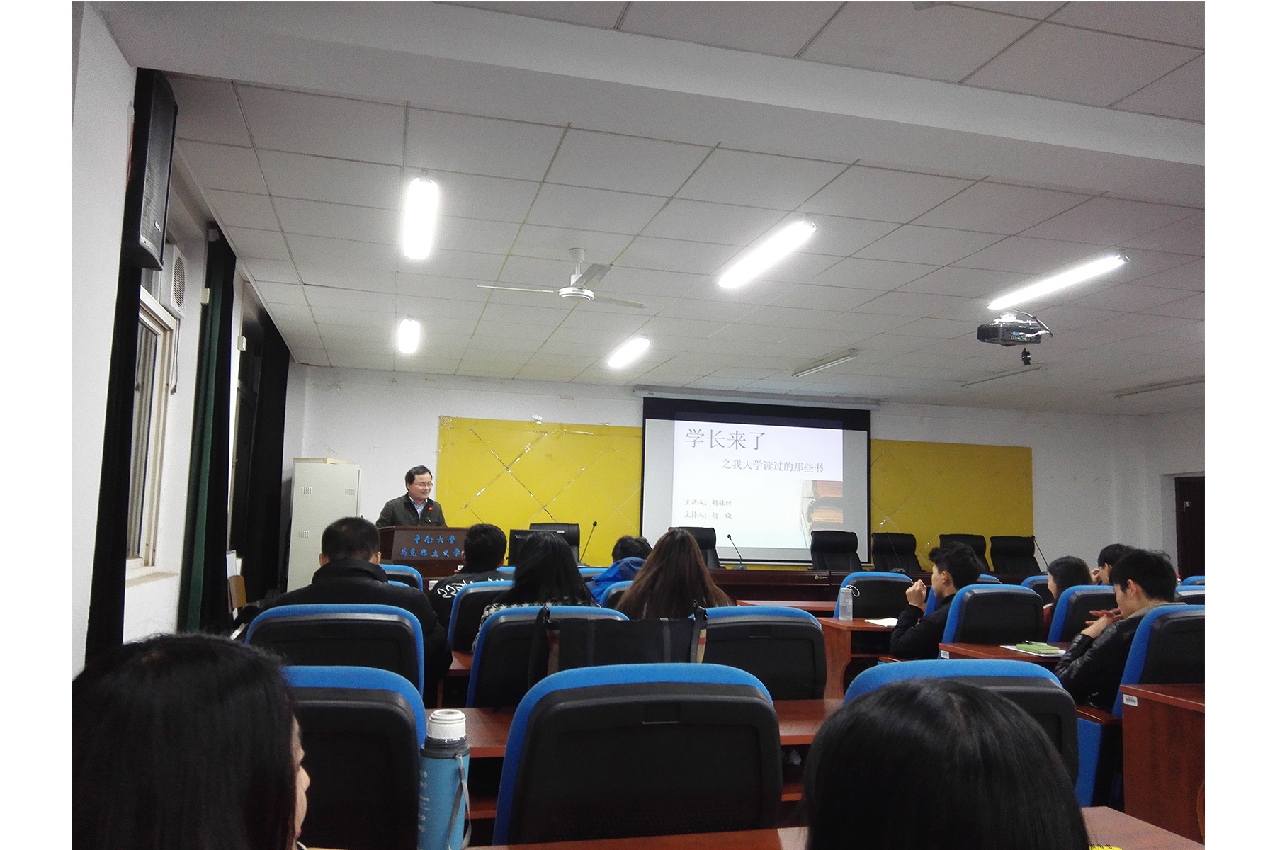 主题讲座开始前,杨书记对学生们提出“好好读书,好好学习”的希冀。讲座开始后,胡栋材老师以幽默风趣地方式讲述了他大学时候的小故事。他提到就算是以前很混沌地度过,但是有一个契机让他接触到了马克思主义和哲学的书籍便从此爱上看书。他还说到,正是因为对《论语》的疑问才驱使他花时间去文献保存室翻看关于《论语》的书籍,来解决疑问。他读书会充满着疑问,而这些疑问就促使他继续去看书来解决疑问,这样把读的书和其他与之关联的书籍阅读完后,发现其中是会有不少的联系和线索的。他全程用自己亲身经历的故事,诙谐而又发人深省地说到如何读书,读些什么书,读书的意义。他提到了《中国哲学简史》、《中国美学史》、《哲学初步》和《形而上学导论》等对其影响深远的书籍。胡栋材老师还建议大学生应该广泛阅读,按兴趣阅读。针对对阅读没兴趣的同学,他也建议应该多去参加社会实践,这样才能有所得。讲座的最后,胡老师用幽默又不失哲理的方式回答了同学们对于生活与读书提问,在座的各位都为其鼓起了热烈的掌声。