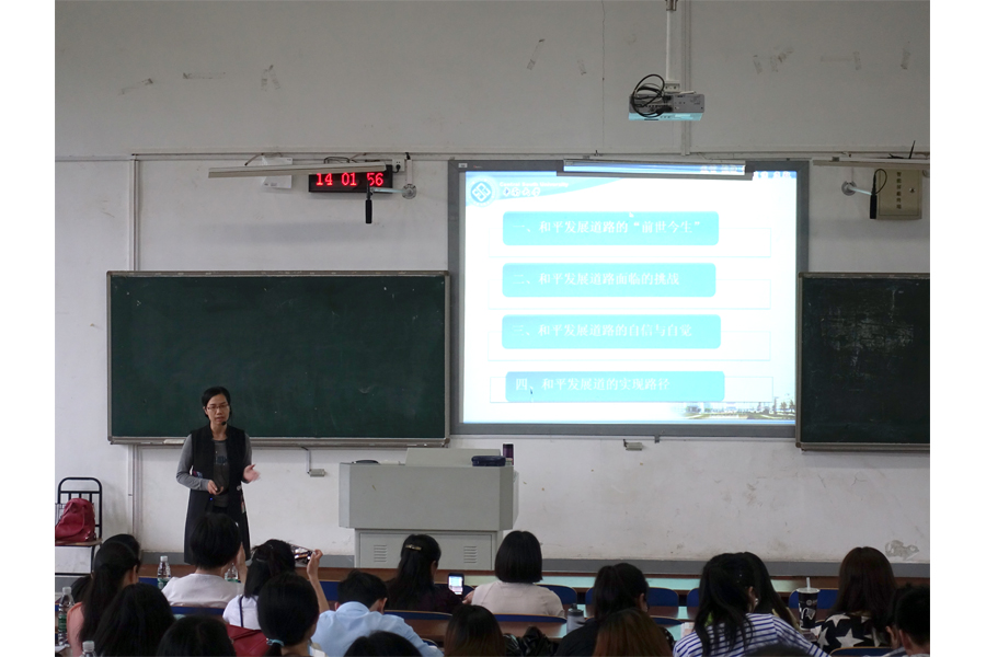 5月19日下午2点,在新校区D座107教室,英国上市官网365的邝艳湘老师带着笑容开始了主题为“和平发展”的思政公开课。前来听课的人员有湖南省近60余所高校的思政课老师与本校的学生共百余人。