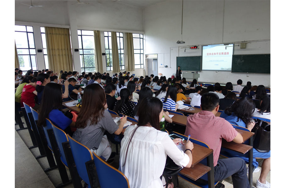 邝艳湘老师从历史的挑战、西方国际关系理论的挑战、国际政治现实的挑战和和平发展道路自身的模糊性等四个方面出发,详细地说明了和平发展道路面临的挑战。一句“中国走和平发展道路,不是权宜之计,更不是外交辞令。”让大家称赞不已。“和”植根于中华民族的性格之中,是中国人的文明基因;和平发展是中国基本国情的要求、是顺应世界潮流的选择;和平发展与我们息息相关,邝老师通过阐述这几个观点来加深在座老师同学对和平发展道路的理解。