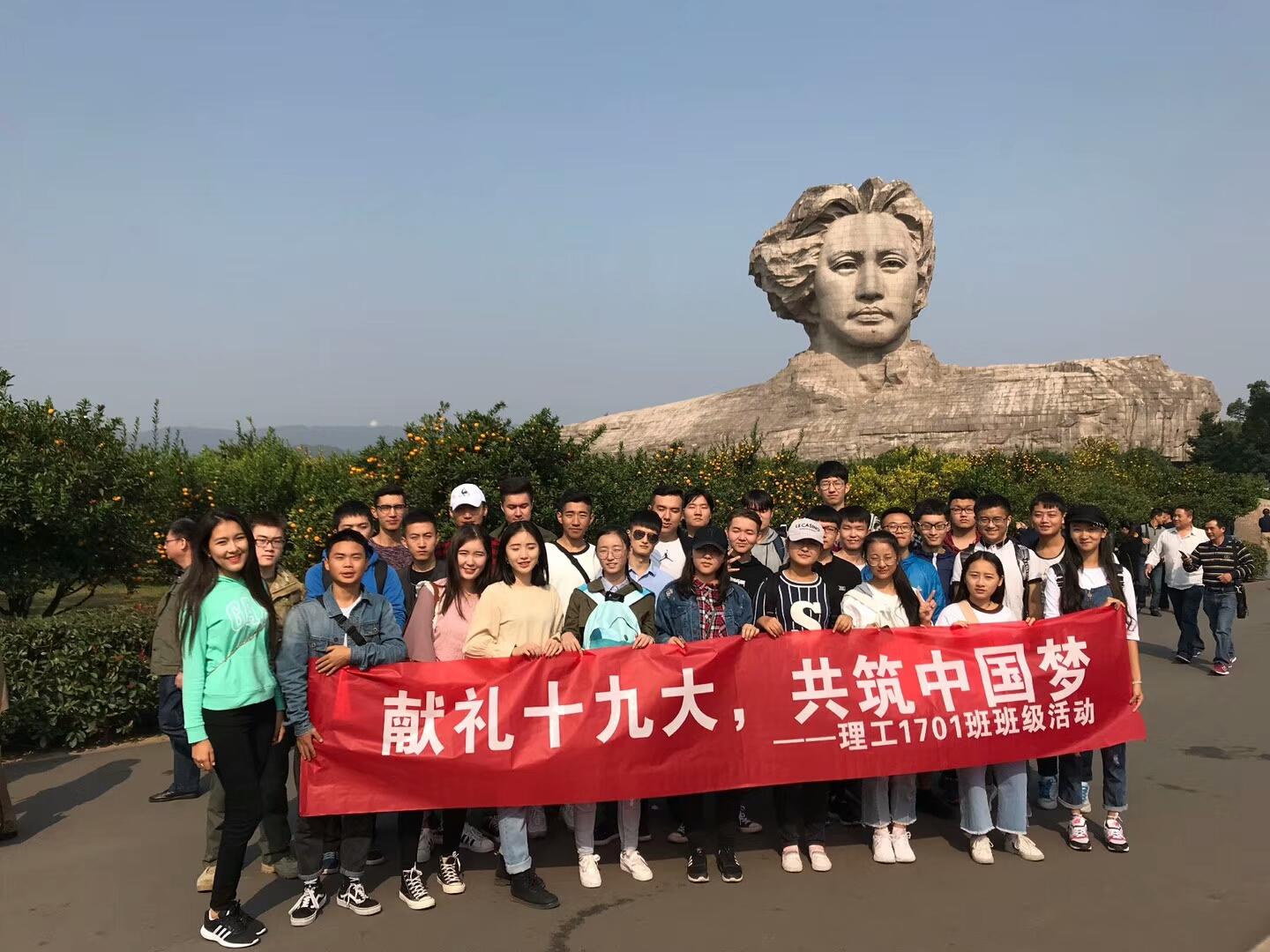 此次活动的地点为长沙岳麓山风景名胜区橘子洲景区,这里矗立着毛主席的雕像,一股崇敬之情油然而生,毛主席作为无产阶级革命家对中国共产党的贡献是不容小觑的,在重大历史时刻能够带领中国站起来,为党和国家事业打开新局面、开辟新境界。理工1701班班级活动选择在这里进行,就是坚信党的十九大精神,在党的带领下,能够为人民创造美好的明天。