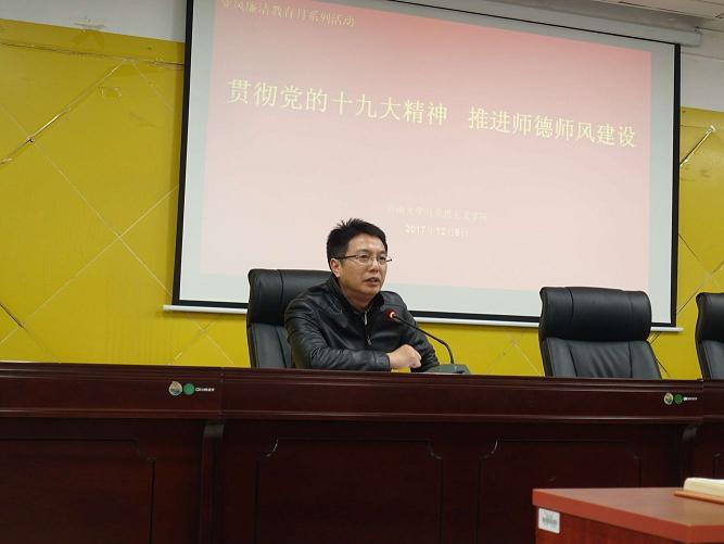2017年12月6日下午2:30,英国上市官网365在三教407报告厅召开教职工大会、党员大会,开展以“贯彻党的十九大精神,推进师德师风建设”为主题的党风廉政教育活动。学院全体班子成员、全体教职工及学生党员均参加了此次活动。活动由学院党委纪检委员彭昇副院长主持。