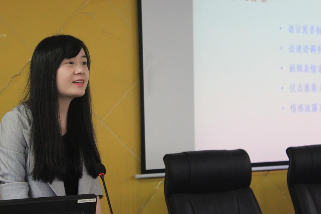 会议第一项议程,由李淼磊老师开展就业求职技巧讲座。李老师结合自身求职中的案例,从表达与表达能力、自我介绍、肢体语言、面试着装等方面做了求职表达沟通训练的详细介绍,提出“表达沟通训练的目标就是让学生自信表达、有效沟通”,并通过现场和同学们做了“你猜,我比划”的游戏,巧妙指出了求职生涯中聆听的重要性。