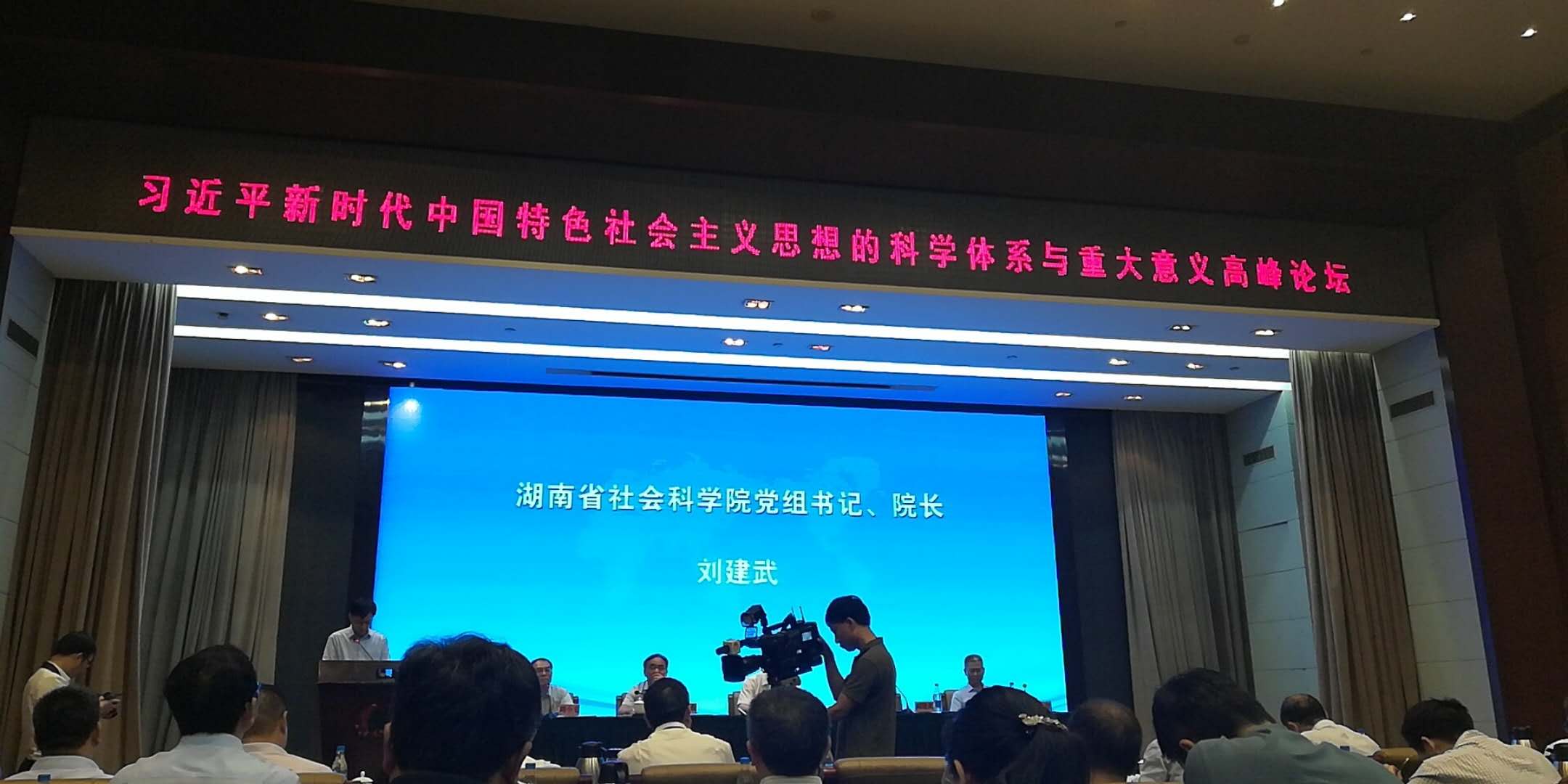 在随后召开的“习近平新时代中国特色社会主义思想的科学体系与重大意义”高峰论坛上,湖南省社科院党组书记、院长刘建武、中国社科院马克思主义研究院党委书记、院长邓纯东先后致辞,中共湖南省委常委、宣传部长蔡振红发表重要讲话。来自《中国社会科学》杂志社、清华大学、中国社科院、《求是》杂志社、湖南大学、湘潭大学、湖南师范大学、广州大学、湖南省社科联的9位专家先后作主旨报告。在学术研讨阶段,来自中国社科院、人民出版社、华中师范大学、西藏民族大学、浙江财经大学、武汉音乐学院、清华大学的9位学者作大会交流发言。我院刘方平老师提交的学术论文《人类命运共同体:开启全球治理新时代》入选本次高峰论坛《论文摘要集》。