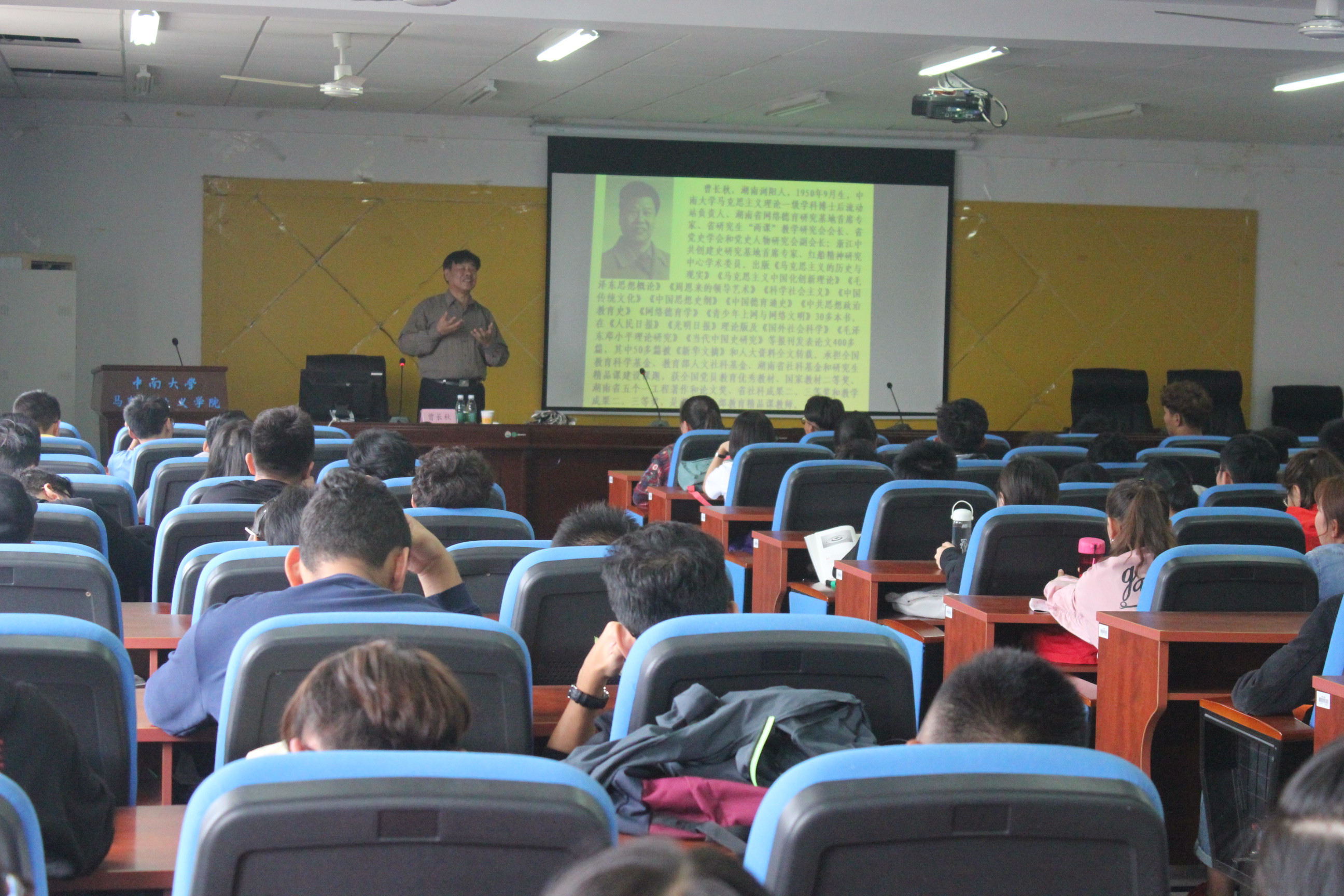 讲座伊始,曾教授以“坚定党的理想信念,增进爱国主义情怀”16字高度概括了本次活动的主题思想,并将主要内容分为“胸怀远大目标,树立必胜信念”、“坚持不忘初心,牢记历史使命”、“把握科学真理,坚守信仰力量”、“坚定心中信仰,挺起信念脊梁”四大板块。他指出:“爱国主义是永恒的话题,爱国主义与国际主义是辩证的关系。”并以我们身边英雄雷锋的故事为典例,生动形象的讲述了一代又一代的中国共产党人在共产主义理想信念的支持下,高举爱国主义旗帜,克服重重难关,创造出时代辉煌,让同学们认识到坚定自己人生理想信念的重要性。曾教授多次引用习近平总书记在党的十九大报告中的讲话,教导同学们应主动担当起作为新一代青年为2050年实现中国社会主义现代强国建设目标而奋斗的责任,告诫同学们应坚持党的指导思想,树立正确的人生“三观”并鼓励同学们在生活中积极践行社会主义核心价值观,为实现自我的人生价值而奋斗。