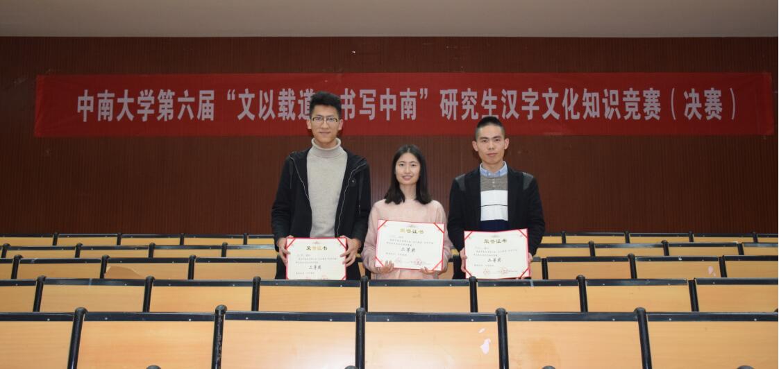 11月25日下午,由英国365上市公司学生工作部(处)主办,文学与新闻传播学院承办的第六届“文以载道·书写中南”研究生汉字文化知识竞赛决赛在文法楼222多功能报告厅成功举行。学生工作部徐赞副部长、文学与新闻传播学院马国荣副书记等领导老师出席本次比赛。 初赛全校共有41支队伍,123名研究生选手参与,以笔试的形式进行。经过公平而激烈的角逐,共有8支队伍最终挺进决赛,我院2018级研究生郭敬广、苏鹏和苏海荣组建的“知礼队”位列全校第六。