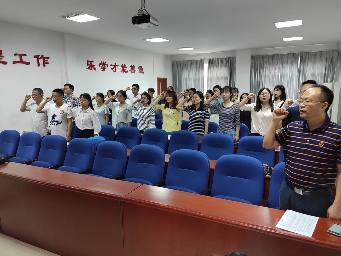 大会伊始,全体成员奏唱国歌。随后杨雪宾书记对党员数目及预备党员情况进行通报。接下来在领誓人邹秉虹老师的带领下,全体党员在鲜红的党旗下光荣宣誓,表达了对党的忠诚与为共产主义事业奋斗终生的决心。