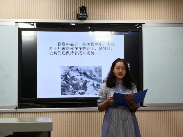 第六组的个人参赛选手彭瀛同学在悠扬的配乐中带来了抗美援朝的感人故事,她通过真挚的情感完美展现了战士保家卫国的不朽事迹,引起了全场共鸣。