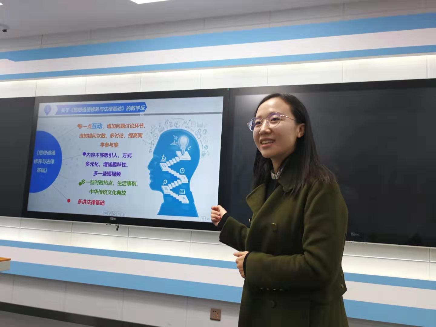 林洁老师以“个人汇报——基于‘思想道德修养与法律基础’教学反思”为题,分享其对于课堂教学的一些思考。她认为思政课教师要从颜值、言值、研值三方面提升、完善、积累,而尤为重要的言值须实现教材话语转向教学话语、政治话语转向事实话语、理论话语转向生活话语、专业话语转向时代话语。当然,理论知识传授并不是终点,在此基础上要实现知识向价值的升华。并结合学生关于课堂教学要注重课堂互动的意见,从课堂互动的宏观把握和微观操作两个层面进行了探讨。