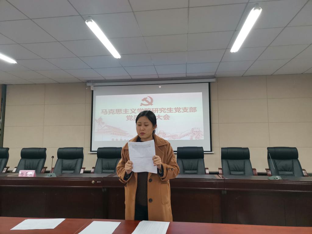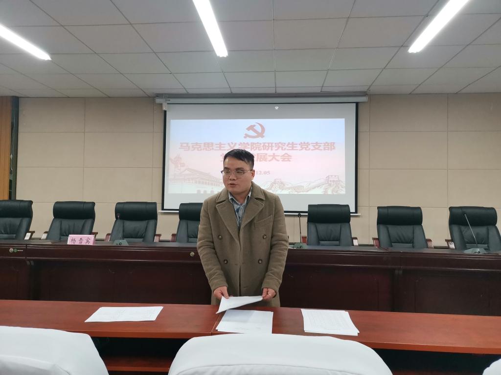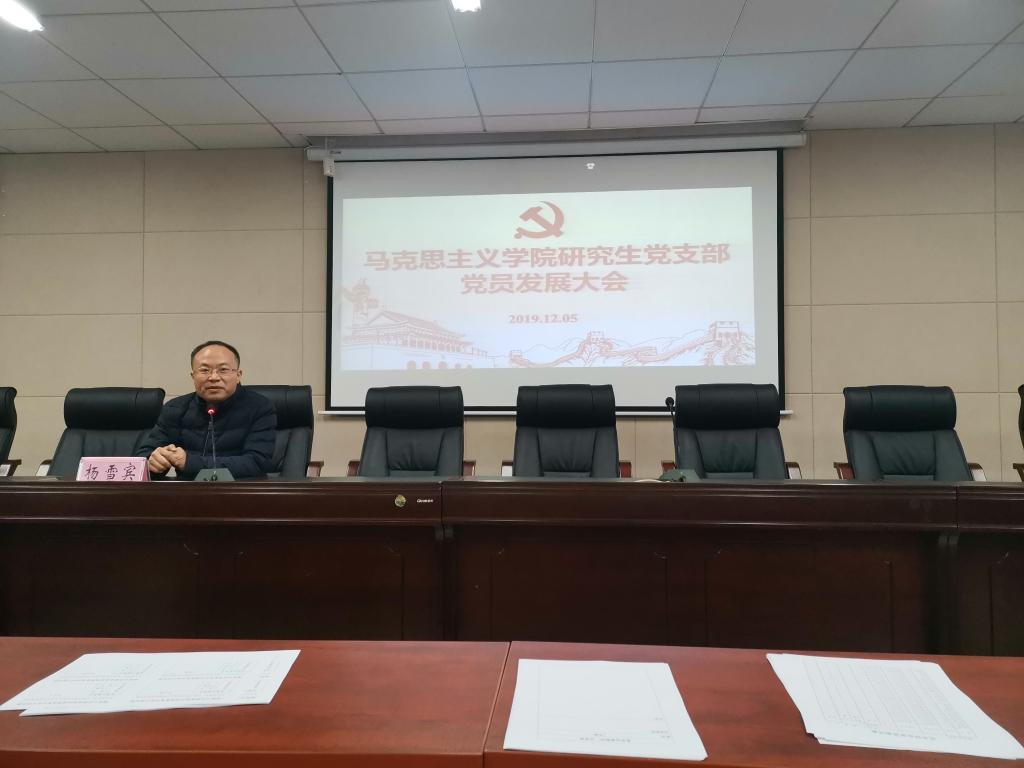 为更好地吸收新党员、为党注入新鲜血液,推进党的基层组织建设。12月5日晚七点,马院研究生党支部于会议室407召开党员发展大会。学院党委副书记杨雪宾及研究生党员、预备党员参加此次会议。会议由支部副书记张维超主持。