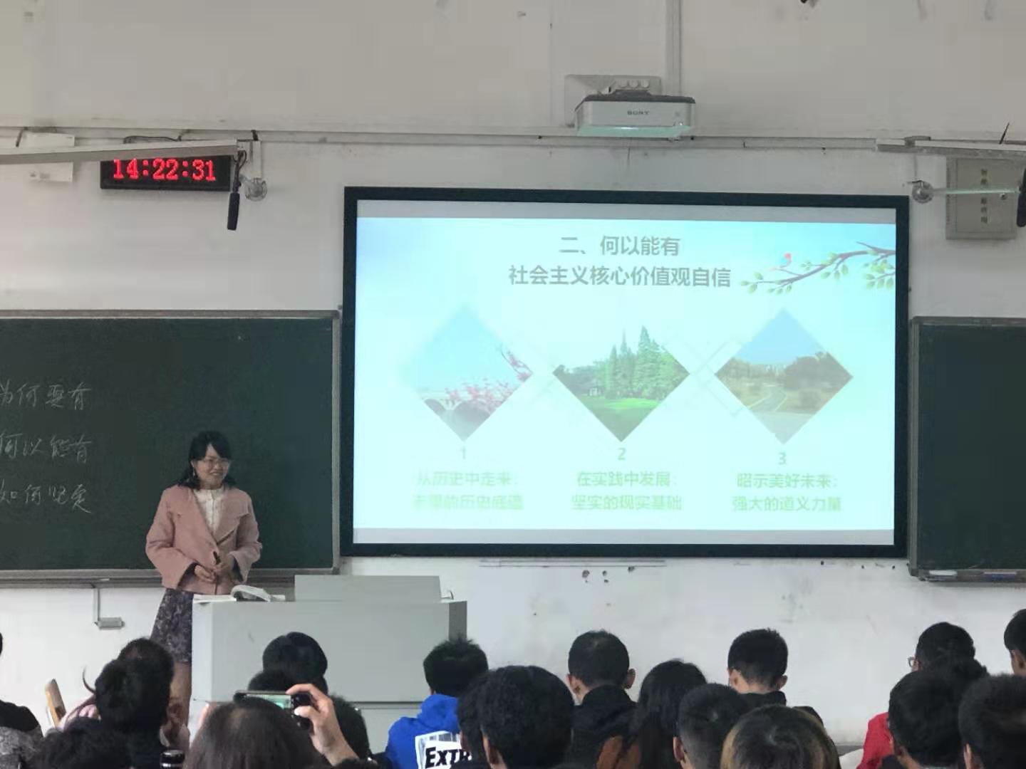 课堂上曹清燕副教授围绕《思想道德修养与法律基础》第四章第二节“坚定社会主义核心价值观自信”的内容,从为何要有社会主义核心价值观自信、何以能有社会主义核心价值观自信、如何坚定社会主义核心价值观自信三个维度,从增强国家软实力、凸显精神独立性角度揭示了坚定社会主义核心价值观自信的重大意义,从深厚的历史底蕴、坚实的现实基础、强大的道义力量角度揭示了坚定社会主义核心价值观自信的底气,从增进理论认知、促进情感认同、自觉践履践行方面启示大学生坚定社会主义核心价值观自信的方式。整个教学设计很好地将科学研究应用于实际教学,实现了从教材体系向教学体系的有效转化。课堂教学中体现出浓厚的家国情怀和国际视野,进一步加深了学生和老师对坚定社会主义核心价值观自信的领悟。