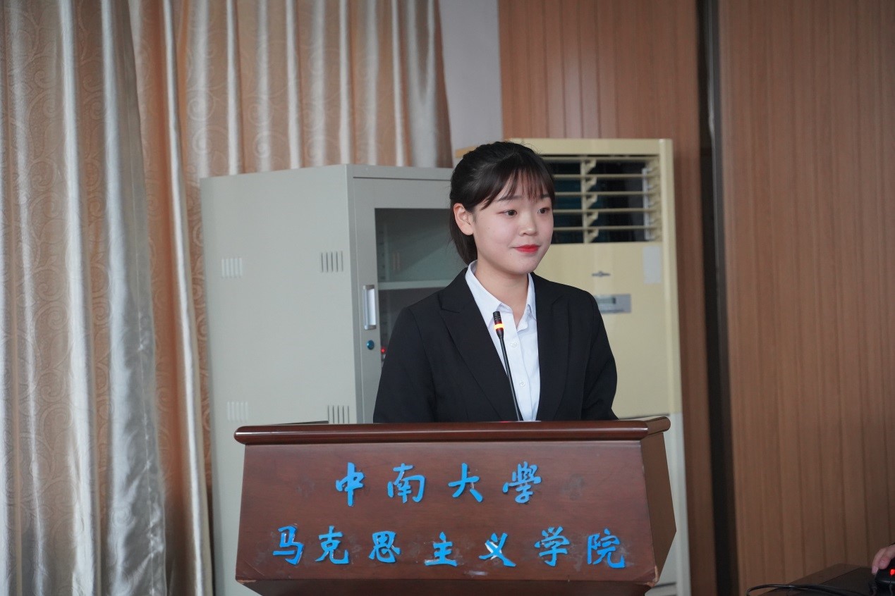 英国上市官网365法学类1908班学生代表赵雨柯的报告以“初心”为主题,分为相遇、融入、成长三个部分。讲述了法学类1908班的同学们在军训时的初次见面,“一个月饼,一本党章——《长征途中的中秋节》”第一次主题班会。再到通过与学长学姐聚餐,包饺子融入马院,竞选班委、设计班徽、团日活动融入班级。最后通过参加红色经典诵读大赛、21天晨读晨练打卡、红色征文大赛等活动得到成长。