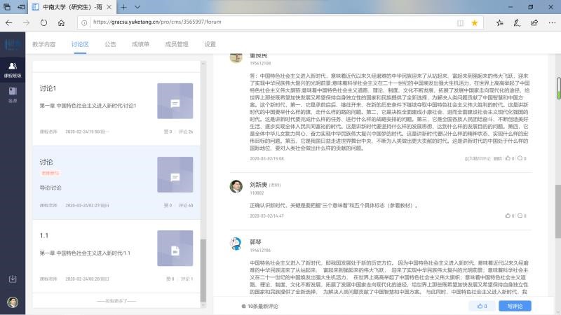 会议中,老师们表示研究生在线教学是一个全新的体验,大家边学边练,迅速进入状态。刘新庚教授是从事思想政治教育专业的教学与科研能手,但之前没有接触过慕课教学。接到任务之后,他以高度的热情和责任心,熟悉慕课教学程序,与学生线上积极互动,给学生提供课外资料,及时解答学生疑问,认真批阅学生作业。黄炎平教授担任《自然辩证法概论》课程负责人,认真组织任课教师开展慕课教学,工作认真细致,并向学院递交了慕课教学工作一周小结。其他与会老师如胡文根老师、徐良春老师、刘业军老师同样积极开展慕课教学,并在同事群、学生群积极与同仁、学生互动交流,取得了良好的教学效果。