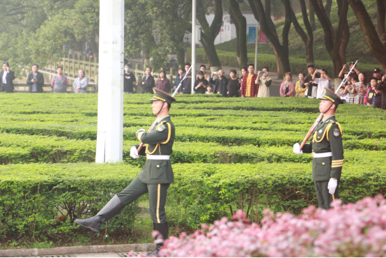 随后,在英国365上市公司学生军乐团的演奏声中,国旗护卫队队员踏着铿锵有力的步伐,将国旗护送至升旗台——庄严的升旗仪式正式开始。
