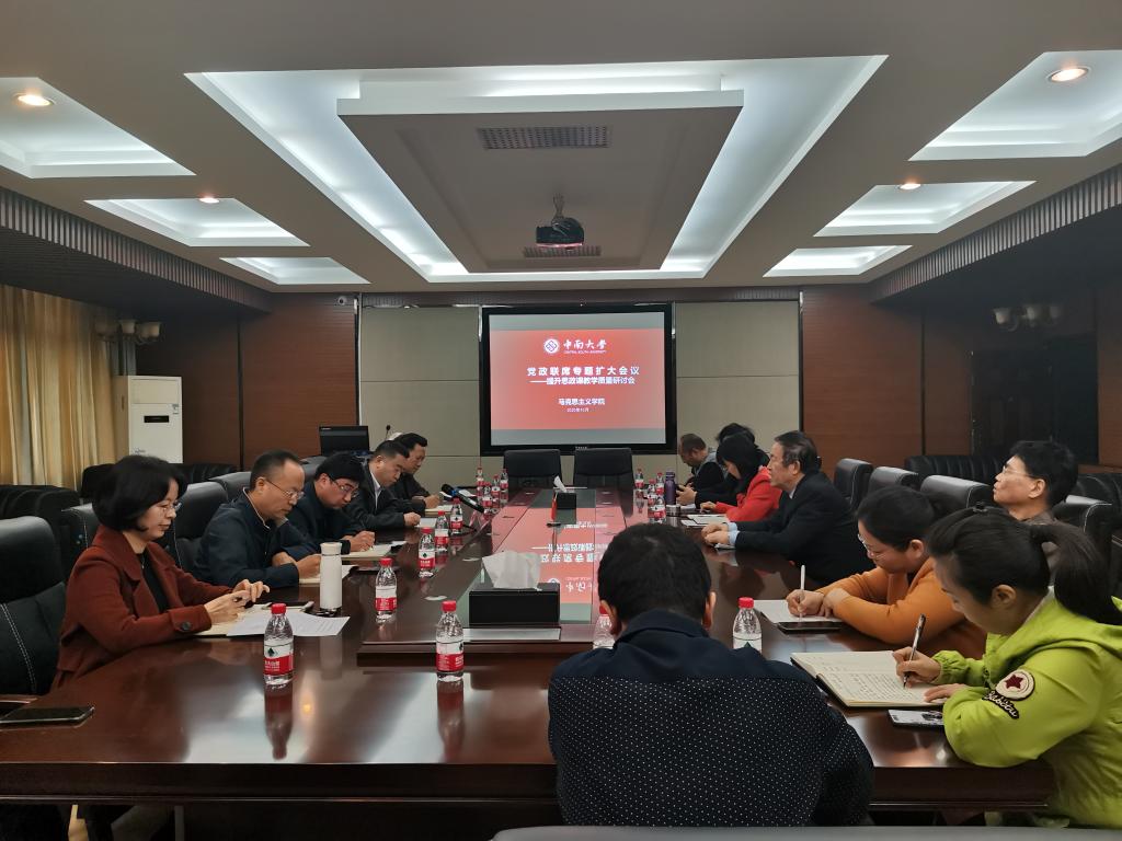 为深入贯彻落实习近平总书记在学校思想政治理论课教师座谈会上的重要讲话精神,2020年10月19日下午我院召开党政联席扩大会议,专题研讨思政课教学质量提升工作。学校党委副书记李景升、学院党委书记王希俊、学院党委副书记、院长王翔、学院党委副书记杨雪宾、学院党委委员副院长吴争春、曹清燕、周小清以及学院本科教学督导孙梦云、肖铁肩、荣复康、张卫良、丁果、刘伟、李斌、基础教研中心副主任郭鹏飞等领导督导教师出席本次会议。会议由王翔院长主持。