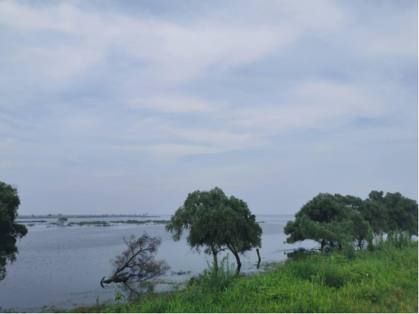 随后,高队长和同学们一起来到洞庭湖一处河堤。队长告诉同学们,这个河堤全长有一百多公里。仅在洞庭湖的边缘,同学们就感觉到了湖域面积的宽阔与壮观,不由自主地感叹道“八百里洞庭”。高队长还为我们补充了相关知识,湖一侧栽的一排排树,可以有效减少湖水掀起的湖浪对河堤的侵蚀,保护河堤。