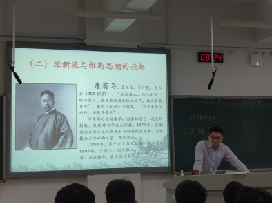 中国近现代史纲要教研中心黄令坦老师所讲的主题是《维新运动的兴起与夭折》。他按照新阶级的产生与维新思潮的兴起;维新变法的兴起与夭折;戊戌维新运动的意义与教训三个部分展开讲解。在讲述过程中,黄老师体现了“纲要”教研中心集体备课“同课异构”的教学理念,同一主题的教学内容,教师深入钻研教材,以做学问的态度思考教学问题,在教学内容的安排与教学方法的设计上,创造出具有自己风格的教学特点。在课后点评会上,大家认为黄老师的教学特点表现为:1.在讲述观点时尽量引用史料原文,引用原始数据,尽量还原历史的真相,史料翔实,较好地满足了学生的求知欲,激发了学生的爱国热情。2.恰到好处地使用历史案例与教学视频。在讲到维新派与顽固派论战的历史时,黄老师播放了一段电影视频,在这个视频里,顽固派连服装、礼仪都不愿意进行改革,形象地表现出维新运动困难重重的场景,给学生留下深刻印象。3.将教学难点设计成课堂讨论题。如“假若袁世凯不叛变,维新运动能够成功么?”这个题目引起学生的兴趣,大家纷纷发表看法。教师从阶级立场、人民立场与实战立场三个方面作了总结,很好地说明了观点。黄老师坚持以唯物史观引导学生树立正确历史观,体现了思政课程的政治性和学理性。督导和老师们建议黄老师在教学内容和教学时间分配上做进一步优化,例如戊戌维新运动的概念要解释清楚、丧国辱权的《马关条约》具体条文最好能展示出来、时间分配上更科学合理、教学节奏把握更好。
