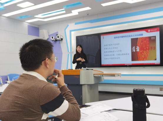 李婷老师首先代表备课小组进行说课,她说课的题目是《社会主义法律的特征与运行》和《坚持全面依法治国》。作为法学博士,李婷老师法理清晰,讲解深入透彻,注重学生法治思维的培养。接着,陈锐老师讲解了《维护宪法权威》和《自觉尊法学法守法用法》。作为资深的一线教师,陈锐老师的讲解更加注重学生法治素养的提升。
