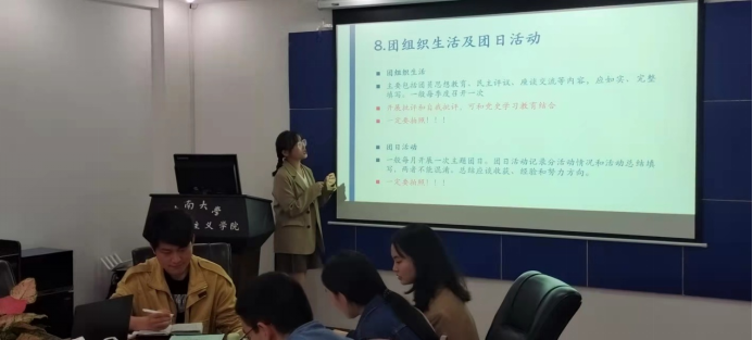 之后,分团委副书记张金卉同学为与会成员讲述了团支部工作手册的使用,她利用PPT的形式,同时通过具体的优秀事例,详细讲述“三会两制一课”的落实,团支部工作评定的标准。使各参会团支书更清楚工作手册的使用和支部评优的标准,为我院各支部工作开展给出了有效建议。同时,张金卉同学再次强调青年大学习网上主题团课的重要性,提醒各团支部书记关注并积极提升本支部的完成度。