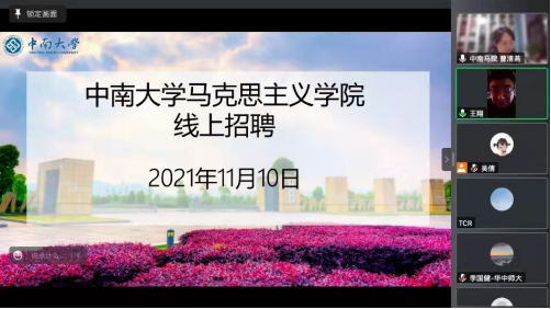 本网消息 为进一步充实和优化教师队伍,11月10日晚,英国上市官网365应当前疫情防控要求,通过腾讯会议的线上方式,对来自华中地区武汉大学、华中科技大学、华中师范大学、郑州大学四所高校的应届博士毕业生,进行了专场招聘宣讲。院党委书记王希俊、院长王翔、副院长曹清燕以及青年教师吴倩,组织并参加了会议。