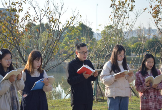 首先,我们进行的第一个活动是“品读习语金句”:胡文根老师以及各位同学共同阅读了《习近平总书记教育重要论述讲义》,通过学习习近平总书记系列重要讲话和指示批示精神,加深对习近平新时代中国特色社会主义思想的理解和认识。大家在八九点钟太阳光芒的照射下,朝气蓬勃地阅读着发人深省的讲义,坚定了新时代青年牢记嘱托、奋发有为的信心和决心,推动习近平新时代中国特色社会主义思想在青年学子中入耳入心入脑。在阅读结束后,胡文根老师针对书中的一部分重要内容结合自身所学知识和见解进行了更为具体的讲解,引导学生学习习近平总书记讲话中蕴含的精神,深刻体味贯穿其中坚定的信仰追求。