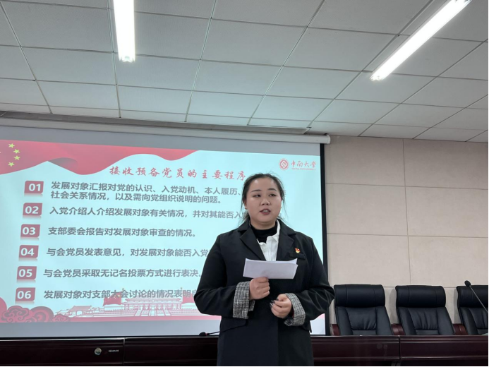 会议第一项,预备党员接收。首先,根据党员发展程序和会议安排,李恒、严亚华、陈紫懿三位同志依次汇报对党的认识、入党动机、本人履历、现实表现以及其他问题,表明入党决心。随后,入党介绍人介绍发展对象有关情况,并对是否推荐入党表明态度,罗昕怡同志代表支委会报告对其审查情况,与会党员就三名发展对象转预备党员进行充分讨论。最后,采取无记名投票方式进行表决,支委进行发票、计票和监票并宣读表决结果,大会宣布李恒、严亚华、陈紫懿三位发展对象全票通过成为中共预备党员。三名同志进行表态发言,表示感谢全体党员的认可和党组织的培养,将始终严格按照党员标准,学在前、干在前、走在前,以实际行动诠释对党的忠诚,自觉接受党组织的监督和考验。