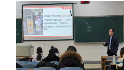 这三位教师分别讲授的是《加强以民生为重点的社会建设》(杨金月)、《为建立新中国而奋斗(前半部分)》(王昕伟)、《商品经济的形成和发展》(徐如刚)。他们的现场教学活动均亮出了自己的八般武艺,表现了一些共同的优点:一是在课前都做了充分的准备。三个课堂都有明显的课程设计方案,从导入到主题展开、内容结构、课堂讨论、雨课堂测试、问答互动、要点板书,到课尾小结、思考题、参考书目,都有一套比较完整的教学活动设置;二是PPT课件的制作都下了功夫。文字、图片、视频、表格、在大小、色彩和形式上都较丰富协调、美观大方;三是讲授的主要内容结构合理,各部分逻辑关系明确,脉络清晰。杨金月的课堂讲了“在发展中保障和改善民生”“加强和创新社会治理”二大部分,王昕伟讲授了“从争取和平民主到击退国民党军事进攻”“全国解放战争的发展和第二条战线的形成”二节,徐如刚讲授了“商品二因素及其矛盾”“劳动二重性及其矛盾”“商品的货币形式及其矛盾”“私有制商品经济的基本矛盾”四大点,其下各又分出若干小目。他们讲授各部分的时间把控基本平衡,没有出现太大的赶课现象;四是三个课堂内容都引述了一定量的马列原著和领袖语录,并加以适当解说,增加了课堂的理论性、思想性。徐如刚基本是依据马克思《资本论》的观点讲解的,且运用了矛盾分析方法,王昕伟展示了毛泽东的二件题词手迹,杨金月引用了多条习近平语录,这是引导学生提升理论思维能力所必须的教学方法;五是各课堂都补充了一些案例,有具体事件、人物,大体联系了历史或现实,有利学生理解课本观点,把握主题。杨金月为了说明民生的一个重要问题即教育发展的不平衡,除了展示高教发展、资金投入表,还举了张桂梅的事迹,说明边疆发展不平衡,需要我们大家都要自觉奉献。徐如刚则举了过度购物引发家庭矛盾的案例说明消费主义的不良影响;六是对课堂学生的落坐秩序都有管理,关注学生的听课情况,间或走动示意,引导学生的注意力集中到课堂学习上。总体上这三场公开课教学活动有使听者眼前一亮的感觉。