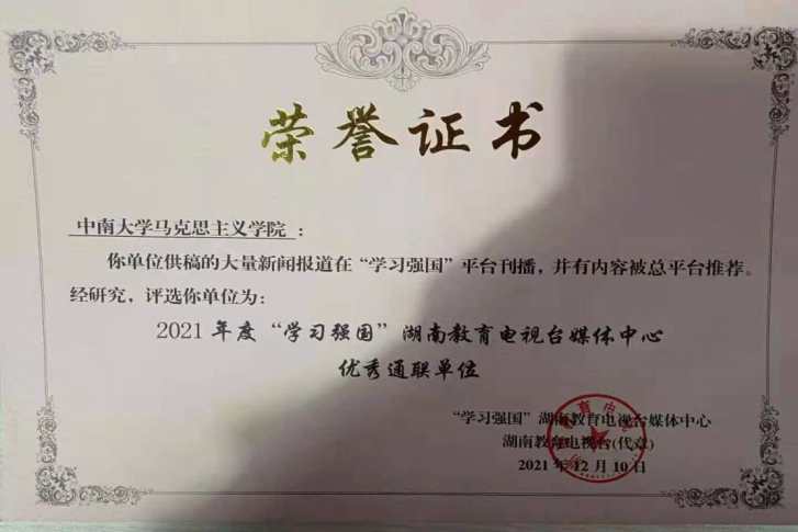 我院供稿的大量新闻报道在“学习强国”平台刊播,并有内容被“学习强国”总平台推荐。2021年12月10日,我院被评为“2021年度‘学习强国’湖南教育电视台媒体中心优秀通联单位”。