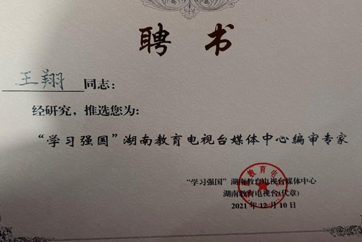 2021年12月10日,英国上市官网365院长王翔教授被推选为“‘学习强国’湖南教育电视台媒体中心编审专家”。