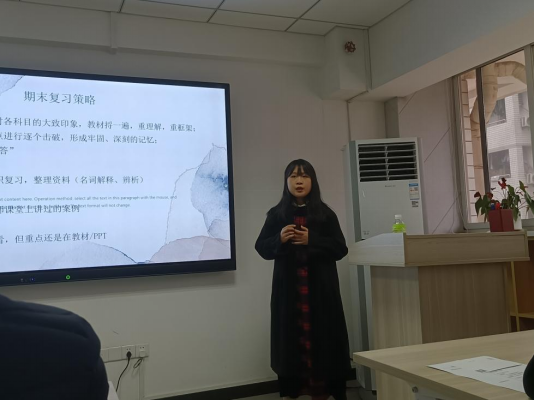 之后,李雪妍同学主要为大家带来考试答题技巧以及考试心态的干货分享。首先,她为同学们讲解了自己的期末复习策略:自我提问与回答,以检验自己是否真正掌握了这个知识点。接着,她就各科试卷中出现的具体题型应当如何回答做了详细而深入的讲解,让大家收获满满。除此之外,李雪妍同学还向大家推荐了一些课外阅读的途径,如知网、学习强国app以及一些比较学术性的微信公众号等。这些分享得到了同学们的一致好评。