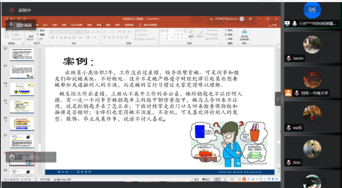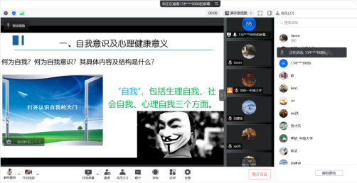 最后,课程负责人叶湘虹老师详细讲解了本课程的课程安排、在线论坛答疑安排、线上线下周次安排、在线教学预案等。强调了本课程教学重要目标之一是教学生学会自助预防、寻求帮助、关注他人,树立“自己是心理健康的第一责任人”的意识,即学生通过学习本课程,能够在遭遇心理问题时,有意识去寻求资源,帮助自己;同时,能够有意识去发现身边人遭遇的心理问题,并协助他们去需求帮助。