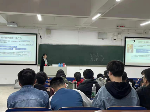 姜芳蕊老师的讲课,始终激情满满。她讲课有四个显著特点。第一,她讲授马克思主义科技观,是按历史发展进程而展开,具有层次分明、脉络清晰的特点。在导入部分,她从19世纪的科技革命、所取得的科技成果视角切入,简要介绍了以机械化、电气化、自动化为标志的三次工业革命,并理论联系当下中国社会实际,提出并简要阐述了“在产业革命中,中国完全能够实现科技弯道超车”的论点。在主干部分,分别讲授了毛泽东、邓小平、江泽民、胡锦涛、习近平的科学技术创新观、人才观、发展观。在结论部分,她以习近平新时代中国特色社会主义科技观为亮色,以习近平对当代中国青年关于“不负青春不负韶华不负时代”的期待为号角。第二,讲课内容熟练,语言流畅、两节课一气呵成,师生在课堂上互动频繁,板书规范。第三,注意发挥学生主体性作用。在上课期间,组织了两次学生成果展示活动。即由两位学生围绕着“科学技术是第一生产力”、“科技人才是第一社会资源”进行展示,两个学生的展示时间不长,但内容充实、精炼,视角新颖。看的出,学生是有备而来。第四,将现代化教学手段引入课堂。姜老师应用“学习通”让学生在线上回答问题。前后出了5道发散性选择题让学生们作答,尽管答案不尽相同,但活跃了课堂气氛。