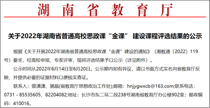近日,湖南省教育厅组织的2022年湖南省普通高校思政课“金课”建设课程评选结果公示,我院曹清燕教授主持申报的《思想道德与法治》课程(主要团队成员:刘伟、刘勇为、季娇、周湘莲)和胡晓副教授主持申报的《毛泽东思想和中国特色社会主义理论体系概论》课程(主要团队成员:李淼磊、刘珺、彭昇、周小清)获评2022年湖南省普通高校思政课“金课”建设课程。