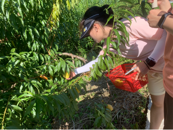 采摘过程中,同学们与自然亲密接触,饱满个大的黄桃捧在手上,咬一大口,果肉饱满,味道香甜。置身于果园绿色的生态环境中,沁人心脾的果香伴随微风袭来,给同学们留下了美好的回