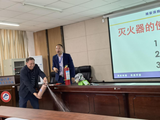 本次会议林教官还展示并说明了的消防器材的规范用法及功效,院党委书记王希俊、副院长周小清现场体验。