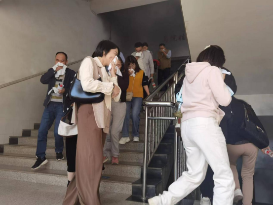 活动的第二环节是实操演练。林教官强调了应急逃生的要领和注意事项,全体教职工在警报声的统一指令下用湿毛巾捂住口鼻,压低身体快速有序撤离。