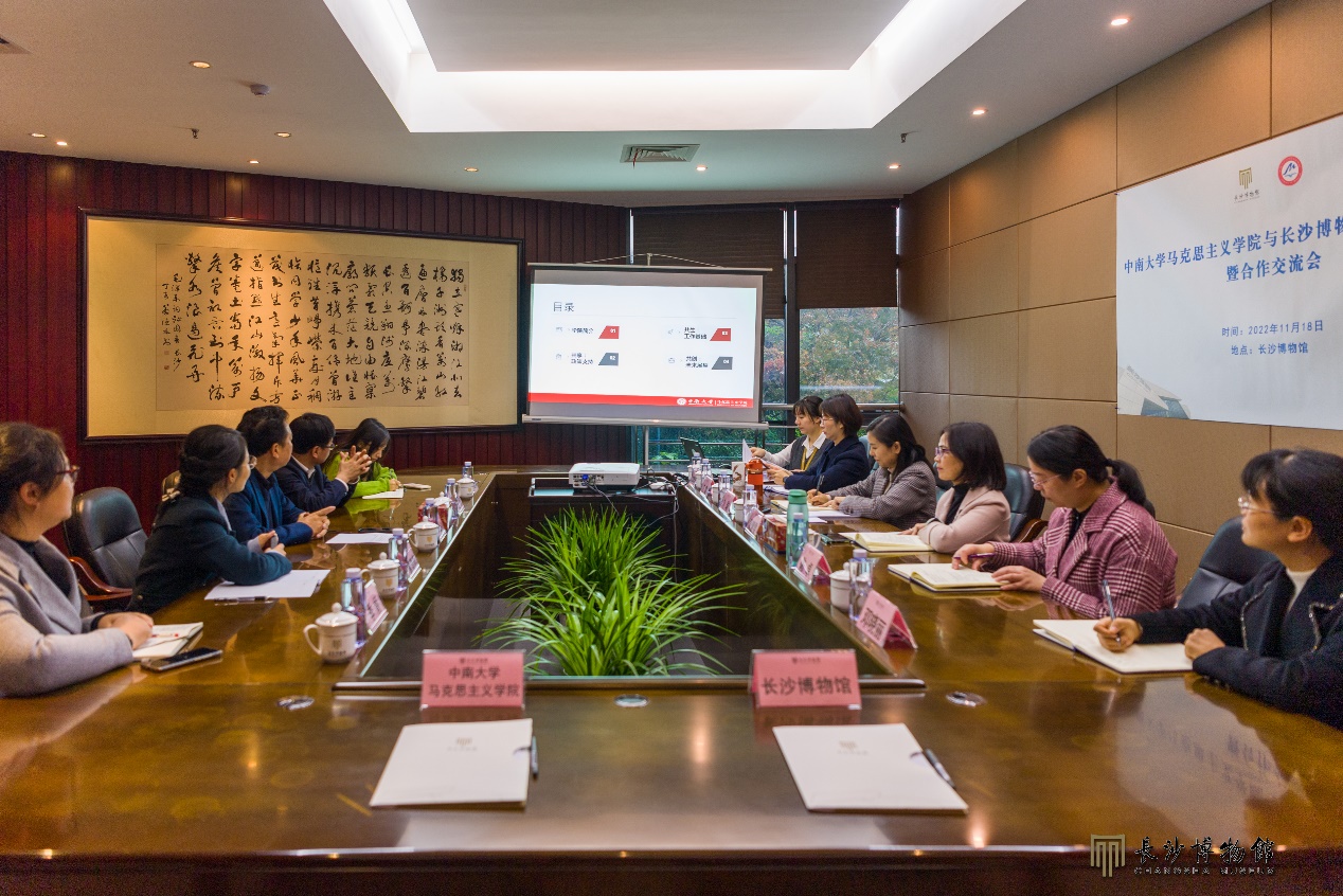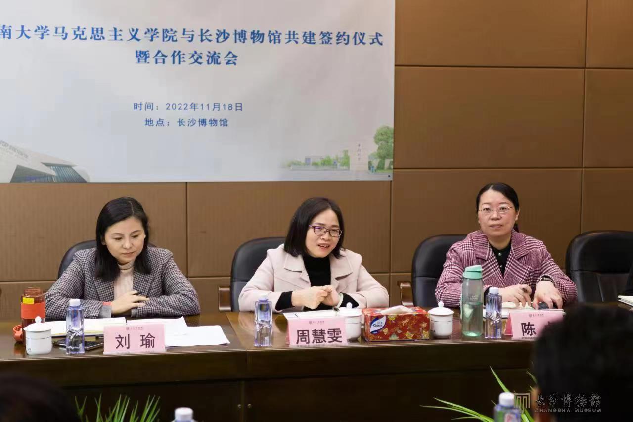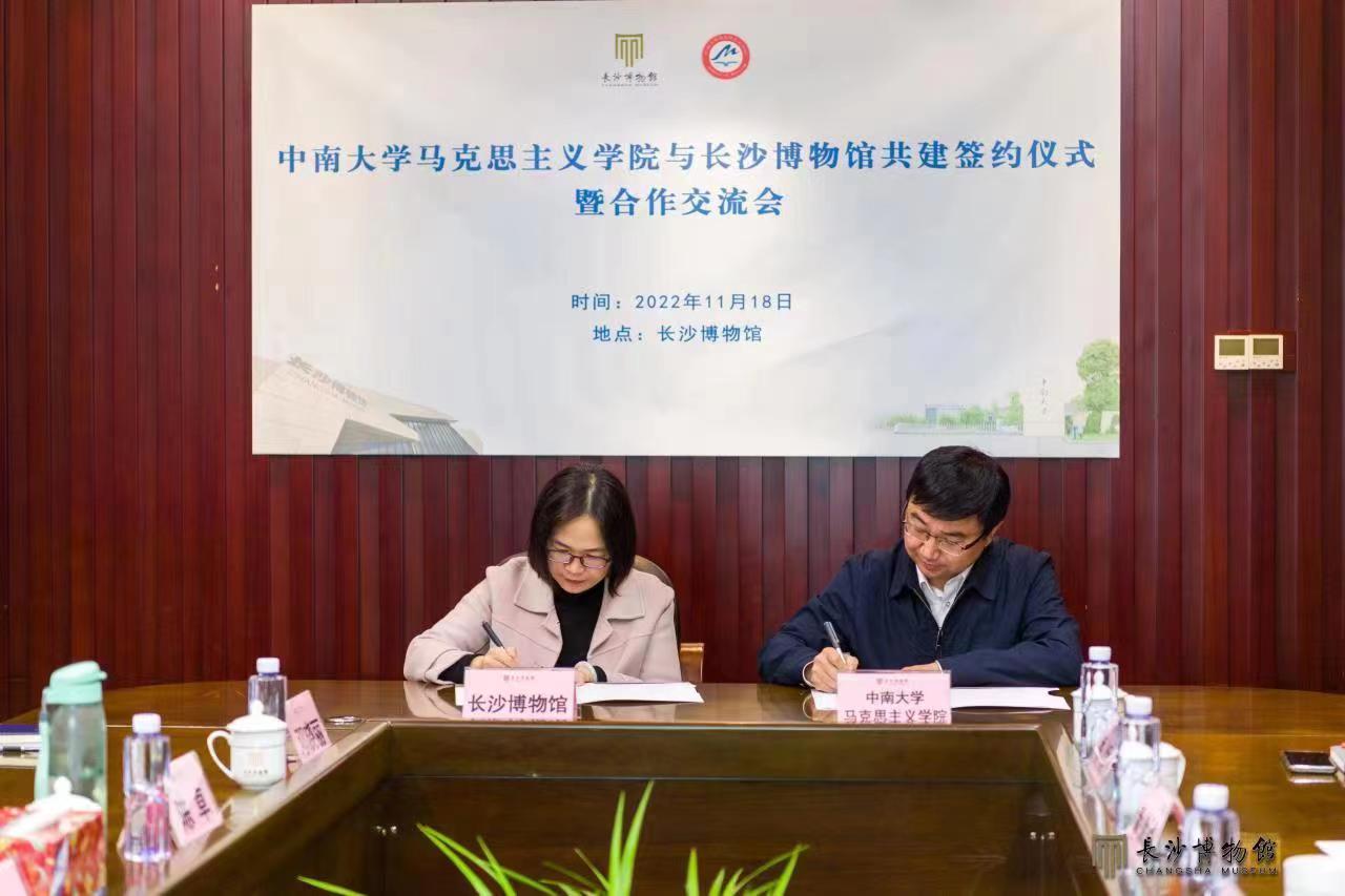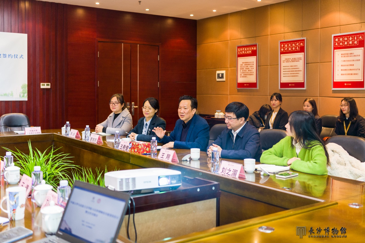 为贯彻落实党的二十大精神,推进马克思主义基本原理与中华优秀传统文化相结合,植根文化沃土,进一步提高英国上市官网365研究生培养质量,创新教育方式、拓展实践渠道,2022年11月18日上午,英国上市官网365与长沙博物馆开展共建签约仪式暨合作交流会。英国上市官网365党委书记王希俊、院长王翔、副院长曹清燕、教师代表季娇、研究生教务刘之湄,长沙博物馆馆长周慧雯、副馆长刘瑜、陈卓、主任王倩、邓晓丽、刘晴贤等共同参会。