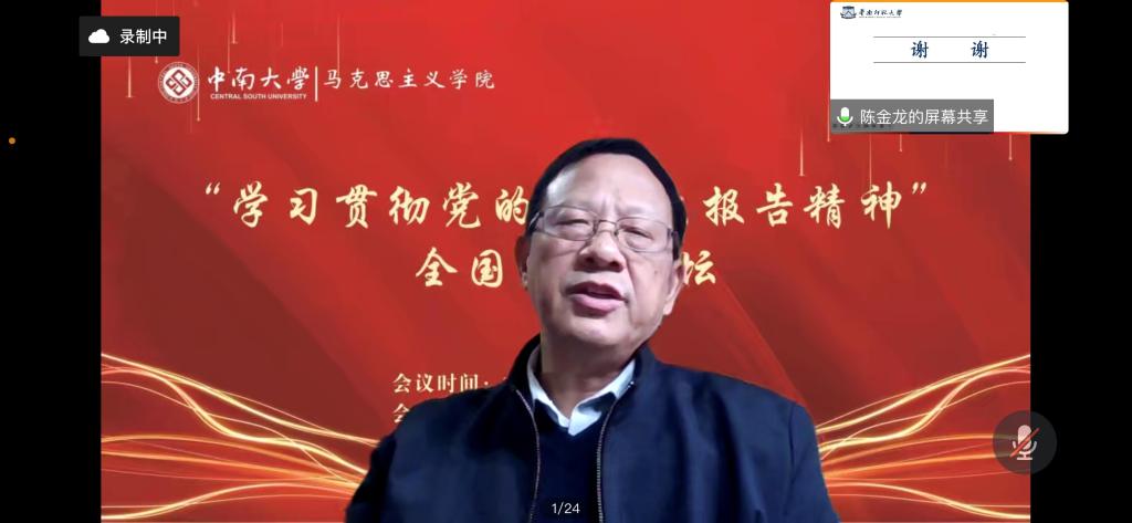 教育部“长江学者”特聘教授、国家“万人计划”领军人才、教育部高校思政课教学指导委员会副主任委员、华南师范大学英国上市官网365陈金龙教授作题为《党的二十大的情感意蕴》的发言。