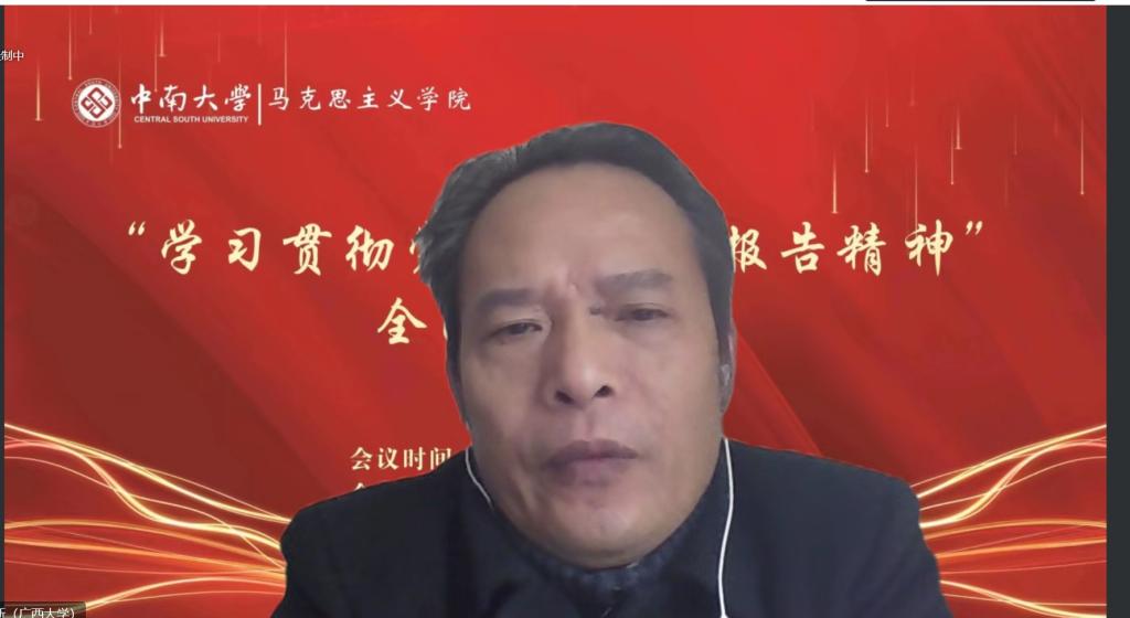 国家“万人计划”哲学社会科学领军人才、中央“马克思主义理论研究和建设工程”首席专家、中宣部全国文化名家暨“四个一批”理论人才,广西大学君武学者特聘教授吴家庆教授作题为《新时代十年的三件大事及其影响》的发言。
